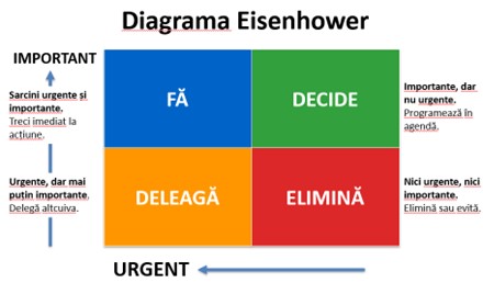 Un instrument util pentru a imbunatatii folosirea mai eficienta a timpului este Diagrama Eisenhower, cunoscuta si sub denumirea de matricea urgent-important. Acesta ajuta la clasificarea activitatilor in functie de urgenta si importanta, facilitand luarea deciziilor corecte privind ordinea de realizare a activitatilor. Prioritatea reprezinta gradul de importanta pe care il acordam unei activitati astfel incat resursele alocate sa poata acoperi totalitatea activitatilor pe baza rezultatului care este adus.